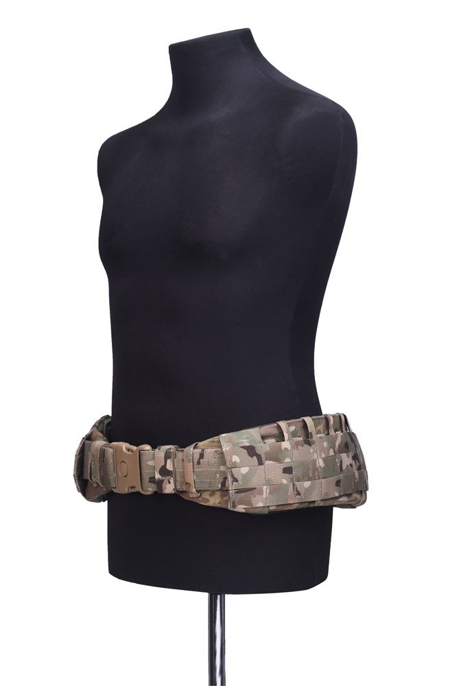 - Усилитель шириной в сам ремень и 5-строчная прошивка придают изделию достаточную жёсткость, чтобы сопротивляться долговременным концентрированным нагрузкам. Высота подушки пояса 125 мм, нет паразитного габарита от окантовки и припуска сборочного шва Подушка пояса имеет высоту 125 мм и 3 ряда строп для крепления подсумков. Это является оптимумом, обеспечивающим максимальный комфорт эксплуатации, как в отношении расположения подсумков и распределения нагрузки от них, так и по влиянию на мобильность. Также убраны внутрь припуски сборочного шва, которые в ином варианте добавили бы 20..25мм на вертикальный габарит пояса. В разложенном состоянии пояс имеет серпообразную форму, что необходимо для получения некоторой конусности при сведении концов пояса. Это даёт плотную посадку по фигуре и равномерное распределение нагрузки на тело. Все основные элементы пояса изготовлены из ткани Cordura 1000D и её аналогов.