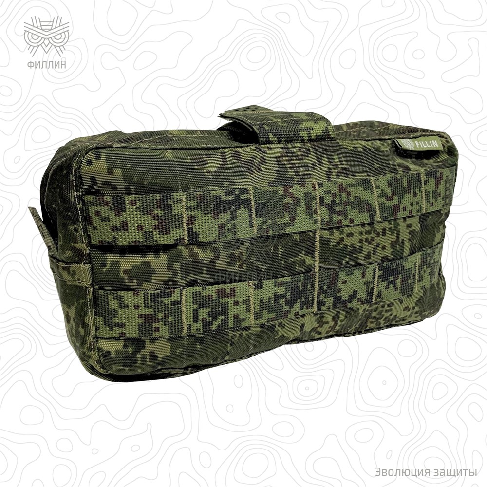 Изготовлен из прочной, износостойкой ткани плотностью 1000D и предназначен для транспортировки снаряжения и необходимых мелочей. На лицевой стороне подсумок имеет молле-перфорацию для закрепления подсумков. Основное отделение подсумка закрывается на двухзамковую молнию и имеет внутри два ряда резинок с множеством отделений для размещения предметов, а так же два сетчатых кармана.